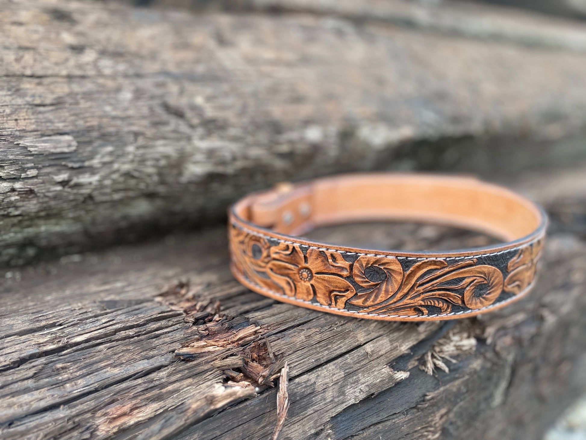 Custom belt to your size. Our belts are 1 1/2 and made out of Herman Oak leather made in St. Louis, Missouri. This belt is our floral belt the design has several flowers throughout the belt along with some leaves and vines.